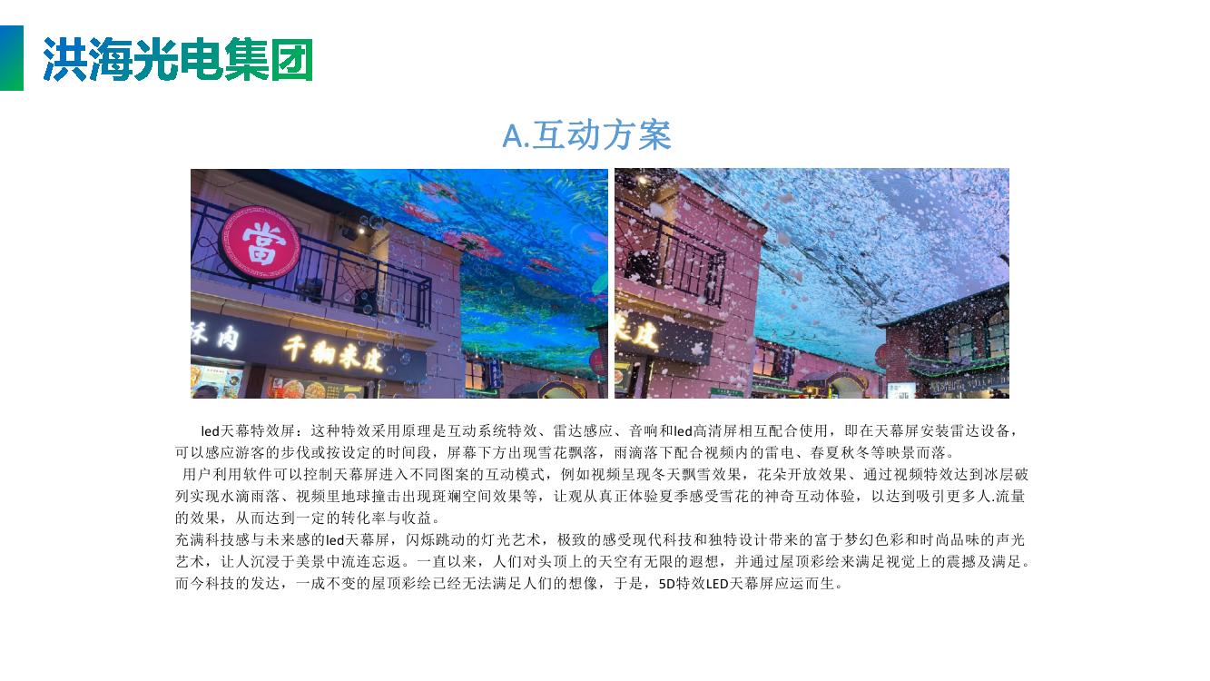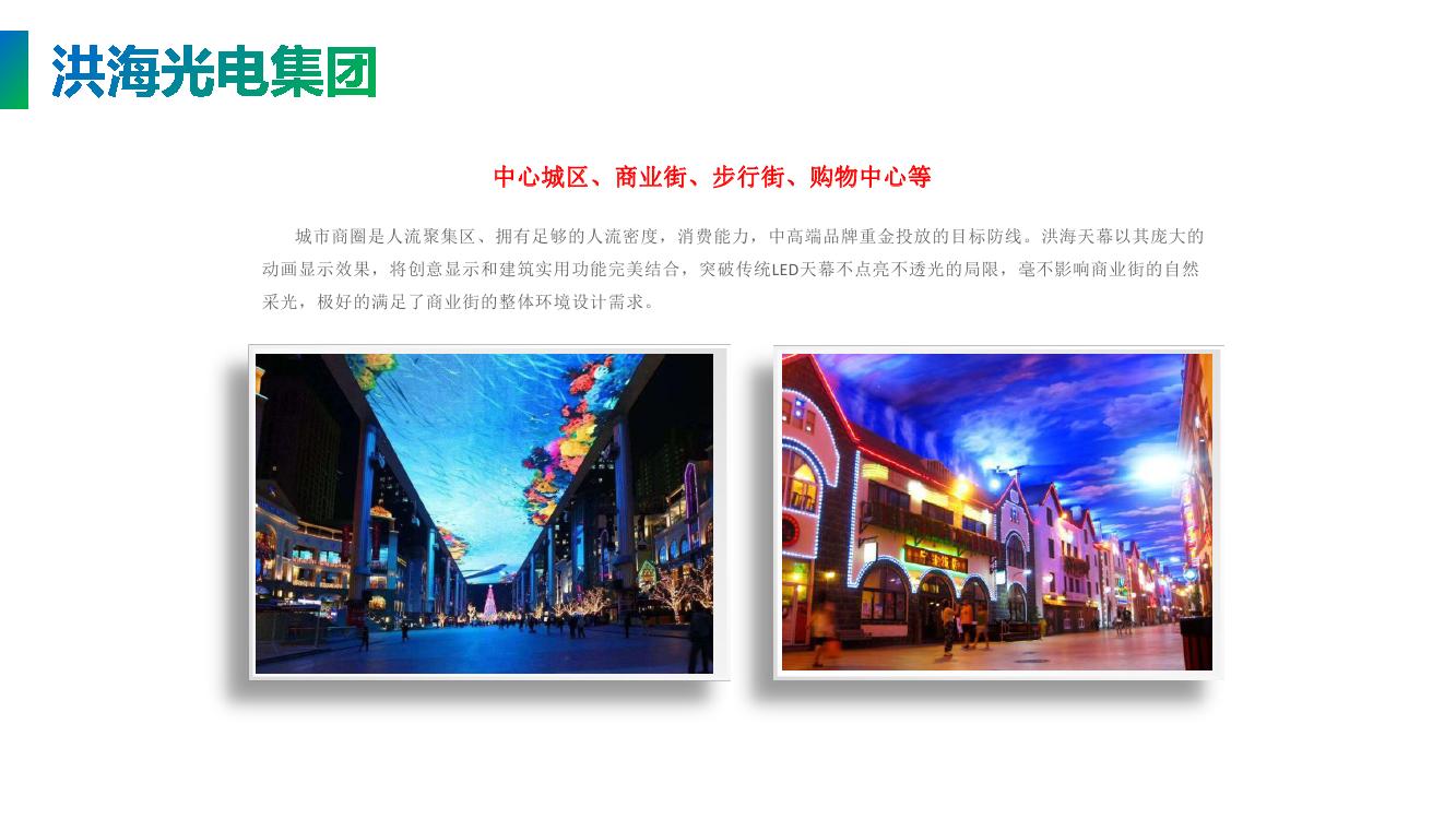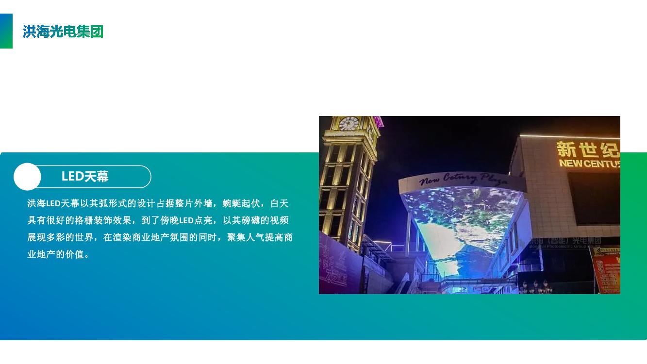 洪海LED天幕(彩色矩陣天幕)以其弧形式的設(shè)計(jì)占據(jù)整片外墻,蜿蜒起伏,白天具有很好的格柵裝飾效果,到了傍晚LED點(diǎn)亮,以其磅礴的視頻展現(xiàn)多彩的世界,在渲染商業(yè)地產(chǎn)氛圍的同時(shí),聚集人氣提高商業(yè)地產(chǎn)的價(jià)值。